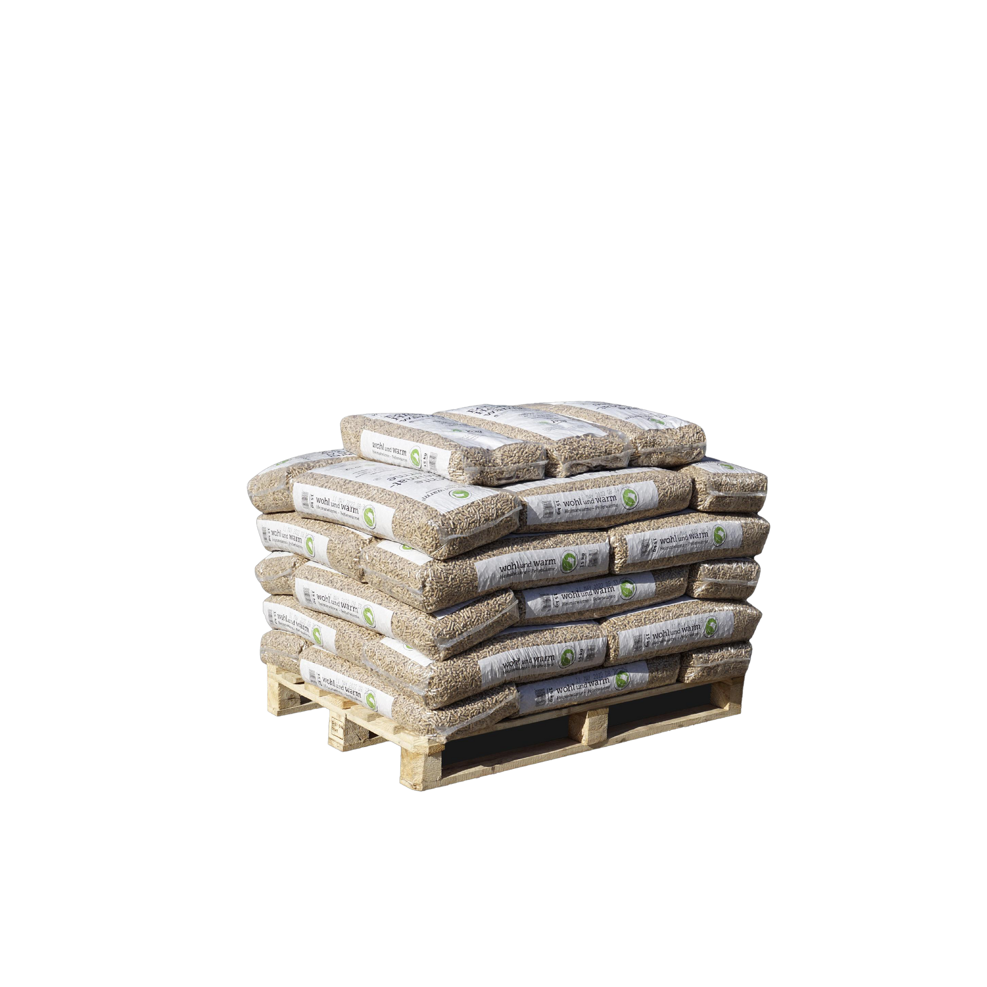 Holzpellets wohl und warm in bester Qualität, gestapelt auf Palette . Die Pellets sind im 15 kg Sack verpackt.
